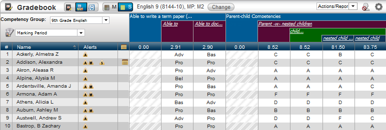 Click to select the gradebook mode. The active selection is highlighted in blue. This selector only displays if the current class has competencies defined. Choices are: