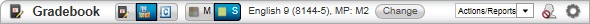 Course information is displayed adjacent to the Multiple|Single mode selector. In single-course mode, the course name and course number-section display followed by the marking period. In multiple-class mode, only the class period and marking period display to make it clear that multiple classes are being displayed. In the toolbar example above, a single course in marking period two is displayed: English 9 (8144-5). |