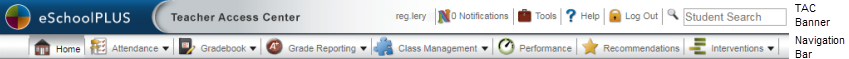 The Navigation Bar gives you a direct path to all TAC pages; it displays buttons for Home, Attendance, Gradebook, Grade Reporting, Class Management, Performance, Recommendations, and Interventions. The Navigation bar only displays options that your building uses. Buttons with a down-triangle () provide multiple options. To display these options, move the pointer over the button to display a drop-down. You can also click directly on the button to display the default page associated with the option. You can change the default for some of these on the Settings page (