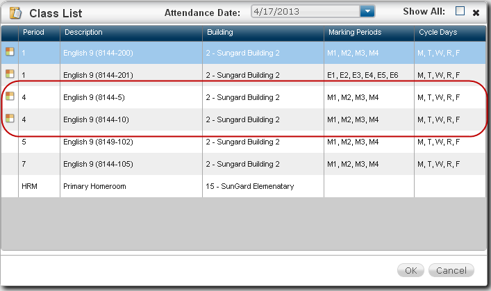 The Class List selector displays an indicator next to the course-sections that are included in Multiple mode for the period. Click Change to display the Class List selector. In the following image, the period 4 classes have been outlined in red to illustrate how you can tell which course-sections are combined for a period.