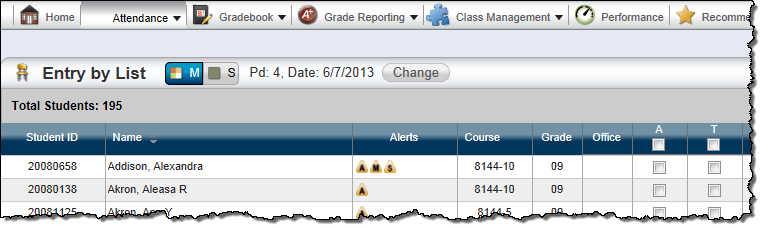 In Multiple mode, the toolbar will display the period you selected instead of course-section information. The students from the multiple classes that meet in the period will be listed in alphabetical order and a Course column displays indicating the course-section for each student.