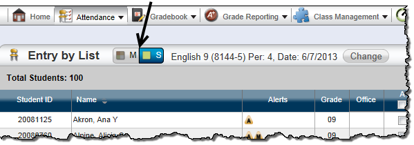 TAC includes a Multiple/Single Mode selector to enable you to select the mode that fits your needs. The selector displays on the toolbar of pages that allow you to work in either Multiple or Single mode. The following illustration shows the selector as it appears on the Attendance Entry by List toolbar when a teacher is in Single mode.