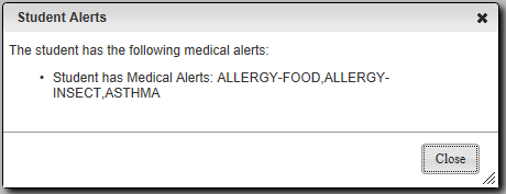 Use this procedure to view student alerts. Student alert icons display next to student names to notify you that the student has medical, academic, special education, personal information, or a non-default grade scale alert that you should be aware of. You can move your mouse over the icon to display a tooltip and you can click on an alert icon to display the alert. Alerts are displayed in a variety of TAC pages (the Gradebook Entry page and the Student Details drawer are two examples).