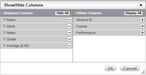 The Show/Hide Columns dialog box opens. All columns currently displayed on the Gradebook page are listed in the Displayed Columns list, and columns available for display (but not currently displayed on the Gradebook page) are in the Hidden Columns list. The top-to-bottom order of the Displayed Columns list matches the left-to-right order of the columns displayed in the Gradebook.